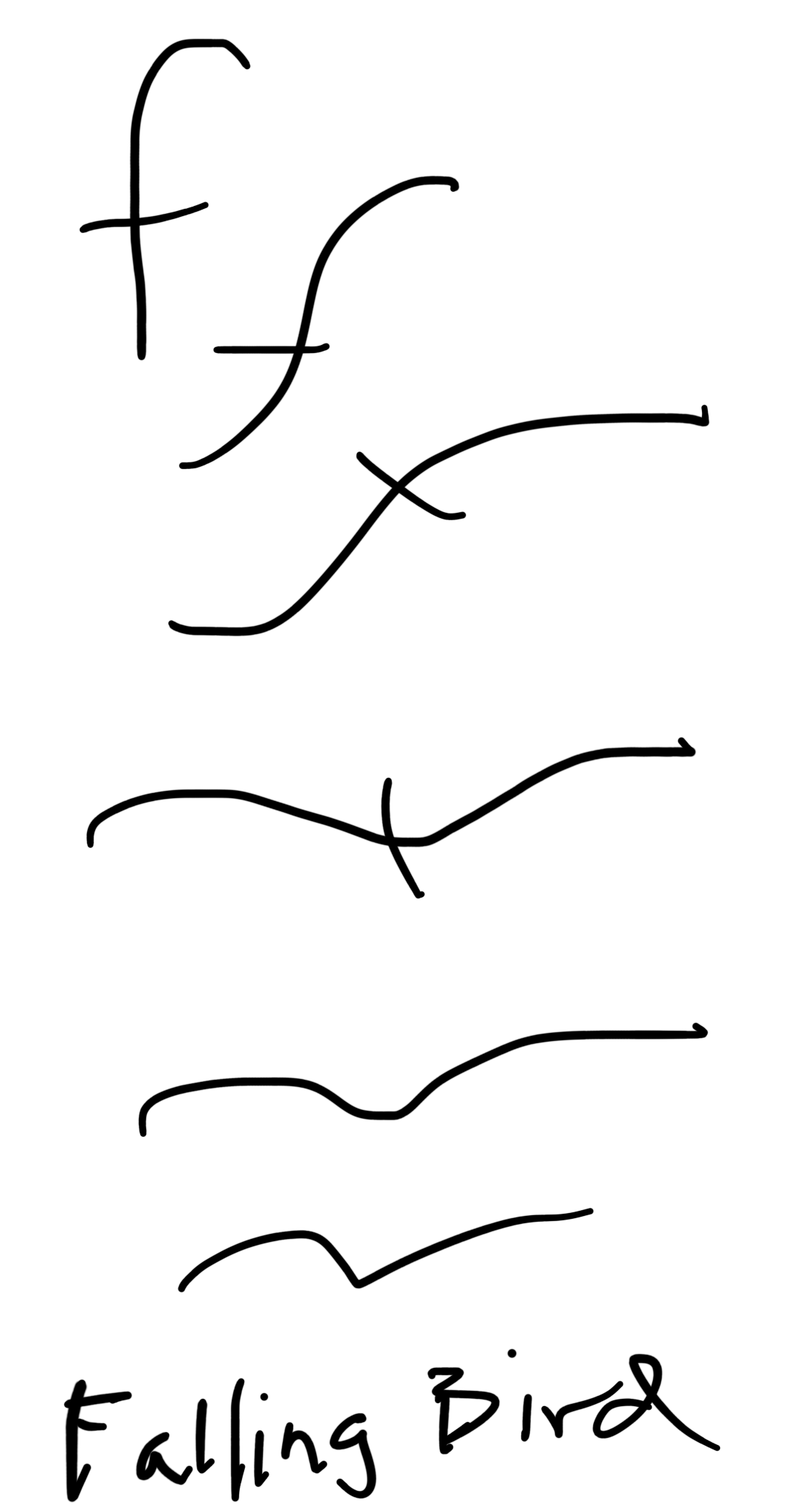 Flight is represented by birds or a group of ‘letter f’ symbols leaning to the right. Essentially italicized.
