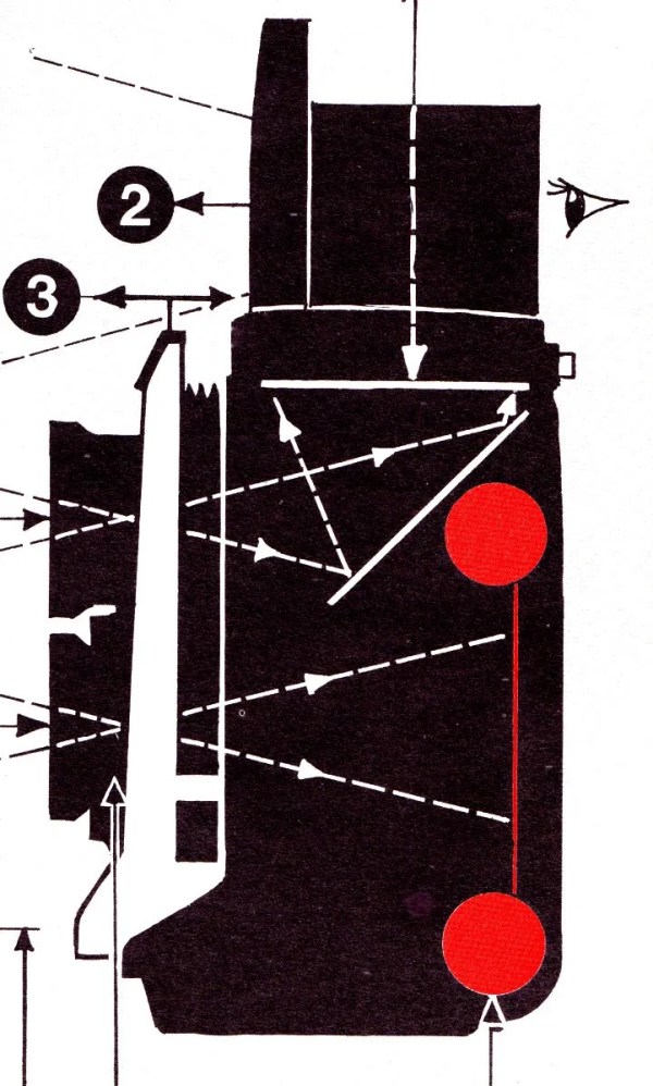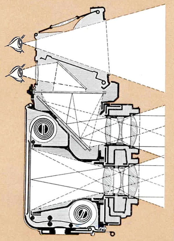The viewing lens generally has a larger maximum aperture than the taking lens in cameras with f3.5 lenses, not only for a bright image in the finder but also to ensure accurate focus, having a smaller depth of field than the taking lens.