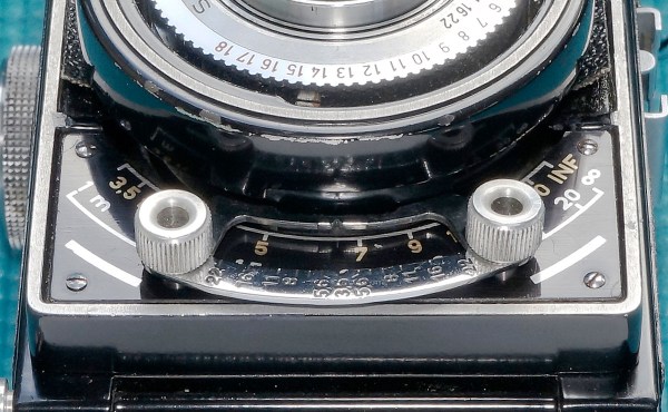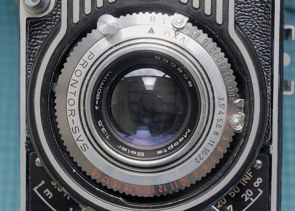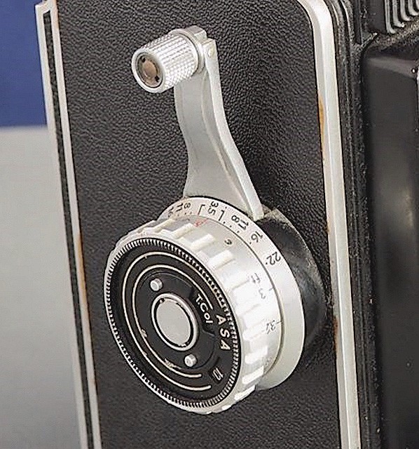 This is another feature of the design which was used in almost every make on all but their most basic models. Levers or wheels mounted on the lens/shutter unit control shutter speed and aperture with the settings visible from above the camera, usually in windows above the finder lens or on top of the shutter housing. The Flexaret I owned had conventional controls on the lens surround without a readout visible from above.