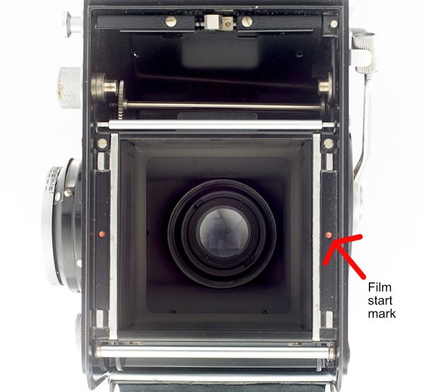 Frame spacing and counting is generally automatic on all but the basic cameras which rely on a red window. Early automatic versions require the first frame to be set in a red window after which counting is automatic. Later this was replaced by matching arrows on the film backing paper with marks alongside the camera film rails, red dots on the Autocord, before closing the back. Winding then took the film to the first frame automatically and set the counter to “1”. Fully automatic loading on later, Rolleiflex cameras used rollers to sense the start of the film passing through them, triggering the spacing mechanism.