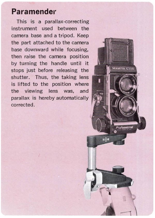 Rollei produced panoramic devices to fit below the camera on a tripod and Mamiya’s Paramenders are particularly clever in overcoming the parallax between the viewing and taking lens for stationary subjects.