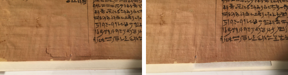 Before (left) and after (right) views of a repair that I made using a remoistenable adhesive tissue applied to the back of the papyrus. Photos by the author