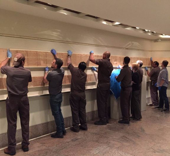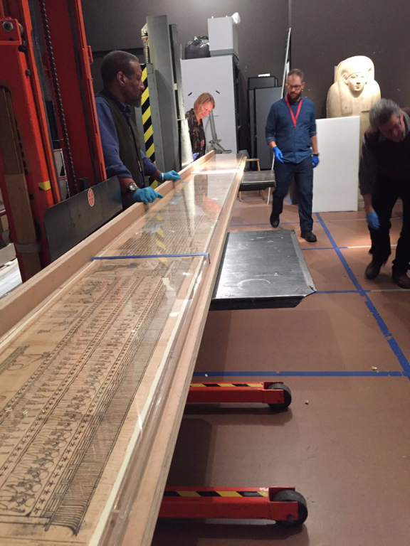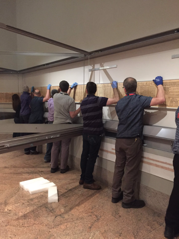 Riggers and technicians deinstalling a section of the Book of the Dead of the Priest of Horus, Imhotep in June 2015. Photo by the author