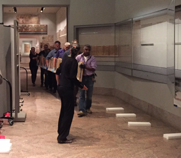 A procession of techs carrying the first long papyrus section to the new case. Photo by the author