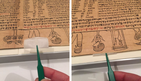 On many of the scrolls, there were areas of lifting flaps of papyrus that needed to be set down with a gentle adhesive. Papyrus scrolls are constructed of two layers of papyrus plant fibers laid down perpendicular to each other without any adhesive between them, and we often see separation of the layers in the form of lifting or tenting flaps of the upper layer. I used hinges (v-shaped rectangles of Japanese tissue paper) and wheat-starch paste to adhere the papyrus to the new backing. After a hinge is placed, it needs to be dried using blotter paper and weights in order to keep the surface planar and free of any staining from moisture.