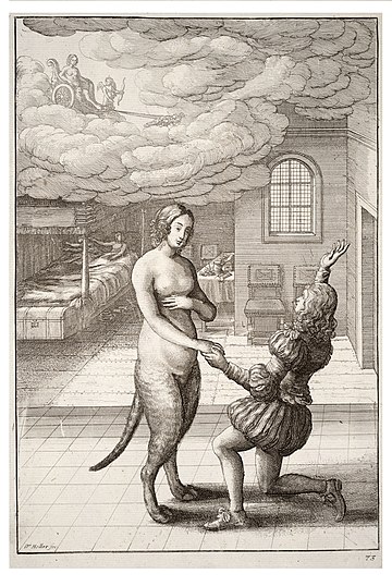 When the fable was related by Hieronymus Osius in a New Latin poem, nearly half of it was taken up by a consideration of basic unchangeability, the sense being echoed by internal rhyme and assonance: "Difficult to elicit, illicit,/ change where nature’s innate".[12] During the troubled political situation at the time the edition of Aesop's fables illustrated by Francis Barlow was published, Aphra Behn gave a sly Royalist tilt to her summing up of the tale’s meaning: "Ill principles no mercy can reclaime,/ And once a Rebell still will be the same".[13] In both these versions a young man besotted with his pet cat prays to the goddess to make the change so that they can marry. The fable in the Barlow volume also has two different titles. On the illustration appears the English "The young man and his cat", while in the Latin explanatory text it reads De Cata in Fœminam mutate (The cat changed into a woman).