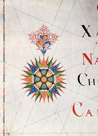 Leading up to and during the Renaissance era, navigational maps took center stage and provided a stark contrast to symbolic maps of the time. As people's knowledge of the world grew through commerce and colonial expansion, the race was on to find new trade routes and raw materials to exploit. The results of surveying coastal territory became known as a portolan chart. The Catalan Atlas c.1375 is an important example of early navigational maps as it provided coastal information such as tides and featured the first compass rose. The compass rose (or wind rose) was a navigational tool used to display the orientation of the cardinal directions, and is still used today. Unlike many other maps, North is shown at the bottom of the map instead of the top.