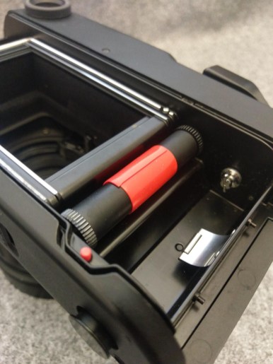 You will need to cut off a 4.5cm (about 2″) length of tape, peel it off its backing material and roll it onto the film roller. It’s quite thick, and that length will be enough to cover the circumference of the roller plus a bit more.