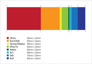 Not all wide-format photography was created equal. Here’s how the negatives produced by the most popular 35mm wide-format options stack up against a “full frame” of 35mm (ordered by negative width and assuming a landscape orientation with sprocket holes masked).