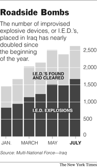 SEPTEMBER 9, 2009. Attacks Complicate U.S. Moves in Iraq. In the worst day of violence against American soldiers in Iraq since combat troops moved out of the cities this year, two bombings left four Americans dead, underscoring the dangers troops here still face even as they prepare for their exit from this country. The American military provided little detail about the attacks, saying only that one soldier was killed in a roadside bombing in southern Baghdad and that three more were killed in another roadside bombing in northern Iraq. [New York Times, 9/9/09]