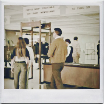 "Hold on there," came a gruff voice. Florence felt a hand grab her by the shoulder. She turned around. An officer was looking at her with an uninterested but curious expression. "I can't let you pass." He pointed to a sign that read "ALL PASSENGERS MUST WILL BE SCREENED BEFORE BOARDING THE AIRCRAFT. AIRCRAFT HIJACKING IS A FEDERAL CRIME PUNISHABLE BY DEATH. CARRYING CONCEALED WEAPONS ABOARD AIRCRAFT IS PUNISHABLE BY PRISON SENTENCES & FINES."