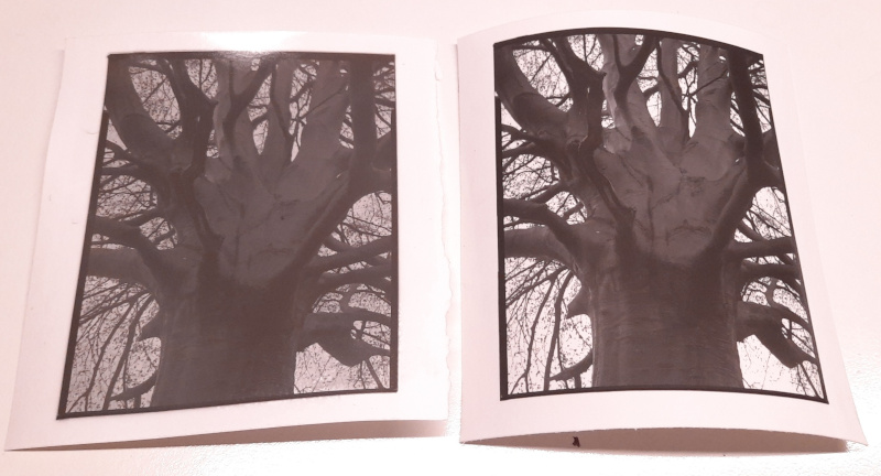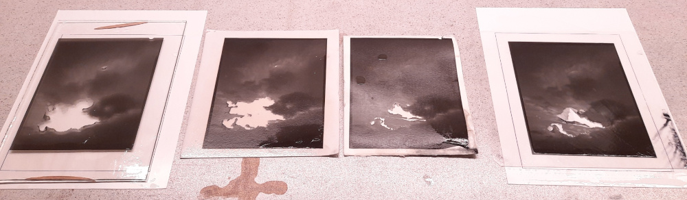 I exposed the first batch of tissues in various ways – using step wedges and a number of negatives, using the 400nm LED UV light source I also use for dichromate-sensitized tissues. Further processing was also along the same lines as I usually do with dichromate, with a number of variations to try and solve the adhesion tissue. Let’s have a look at these.
