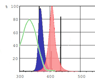 If we overlay the DAS absorption chart on the spectral curves of both light sources, we get this: