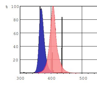 This shows that the emission of a typical 405nm LED is a nearly completely disjunct from the absorption spectrum of DAS. In other words: I’ve got lots of UV LED light, but the DAS is effectively blind to it.