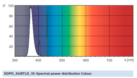 Now let’s look at the Philips Actinic BL tubes I was using before. This is their spectrum according to the current datasheet of that product line, which again will be similar or identical to the actual product I’ve got right here: