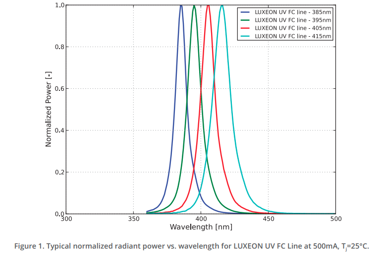 So what’s going on here? I’m not entirely sure, I must admit. Obviously, there’s the matter of wavelength. Let’s see what a LED puts out, going by a fairly randomly selected spectral distribution chart of Lumileds Luxeon UV FC LEDs. Note that these are not the ones used in the Chinese floodlights I’ve been using, but emission spectra of LEDs are pretty similar overall.
