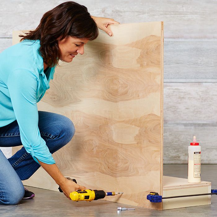 Attach the bottom to the base frame using glue and screws. Drill a countersunk pilot hole to avoid splitting the wood before driving each screw. With the bottom attached, secure the back to the base. Apply glue to the back base rail, then clamp the back in position and secure with screws.