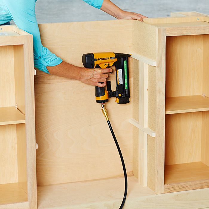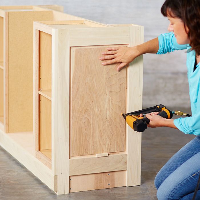 Remove the doors from the pre-assembled cabinets and sand both the doors and front frame. Apply glue to the back of the cabinet and to the edge of the face frame that fits behind the corner stiles and against the ends. The slight overhang of the corner stile will conceal any gap between the cabinet and the side of the island.