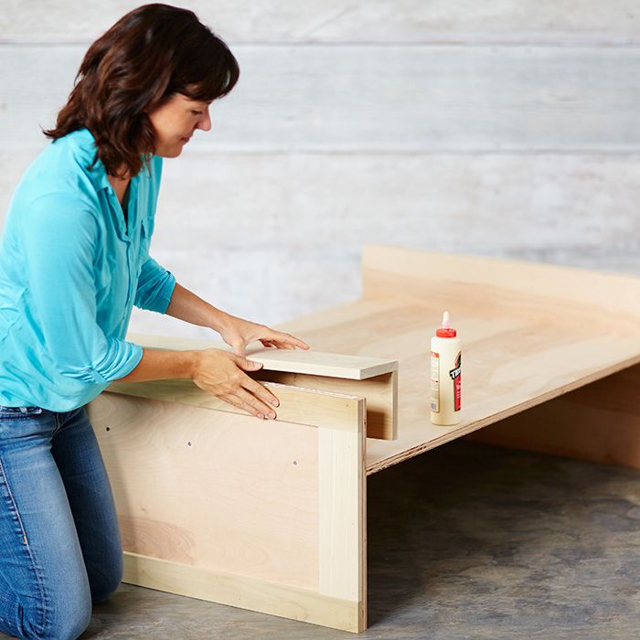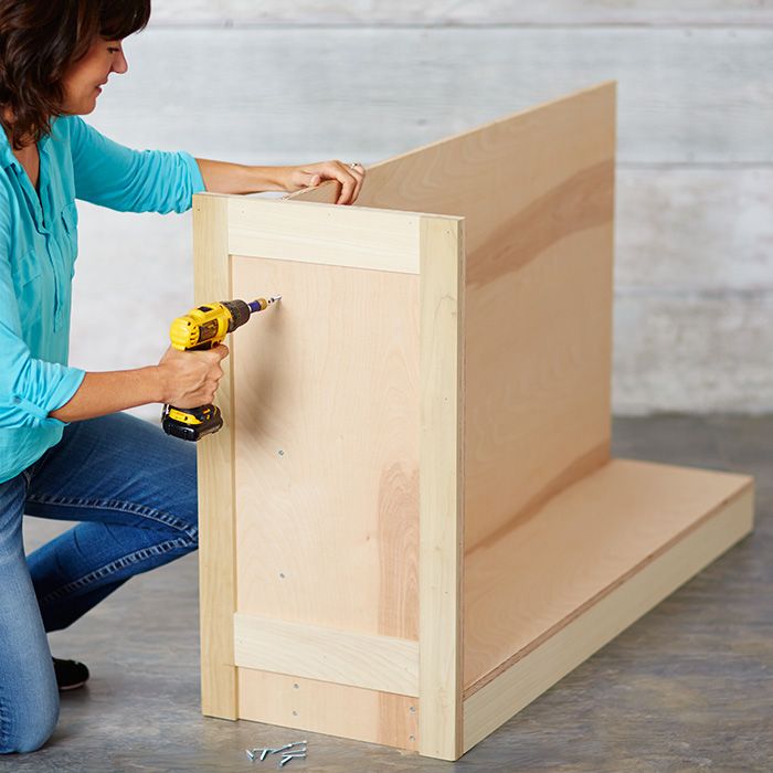 Glue and nail the rails to the plywood end panel. The top rail is even with the top of the panel. The bottom rail is located 3 inches above the bottom of the panel. The base trim will cover this space. Fasten the remaining stile, and repeat for the other end assembly.
