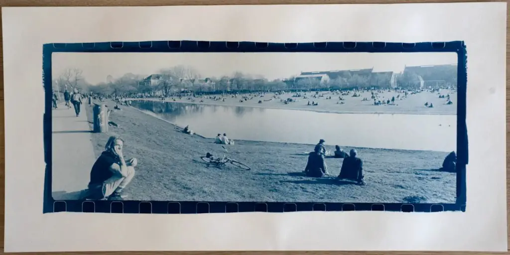 I’ve been shooting black and white film for over 18 years, and since a few years ago, I have had my own darkroom set up in the basement. I love to do some uncomplicated printing on RC paper every now and then. When I built my own XPan-format panoramic camera, I was confronted with a problem. How do I print these negatives large enough for the photos to shine? Black and white paper in large sheets is very expensive, so I wanted to try something else. I had tried to do photoetching with an enlarger before, so when I saw a youtube movie on cyanotypes something in my mind clicked. I was going to build a UV lamp into my enlarger and print large cyanotypes onto watercolour paper!