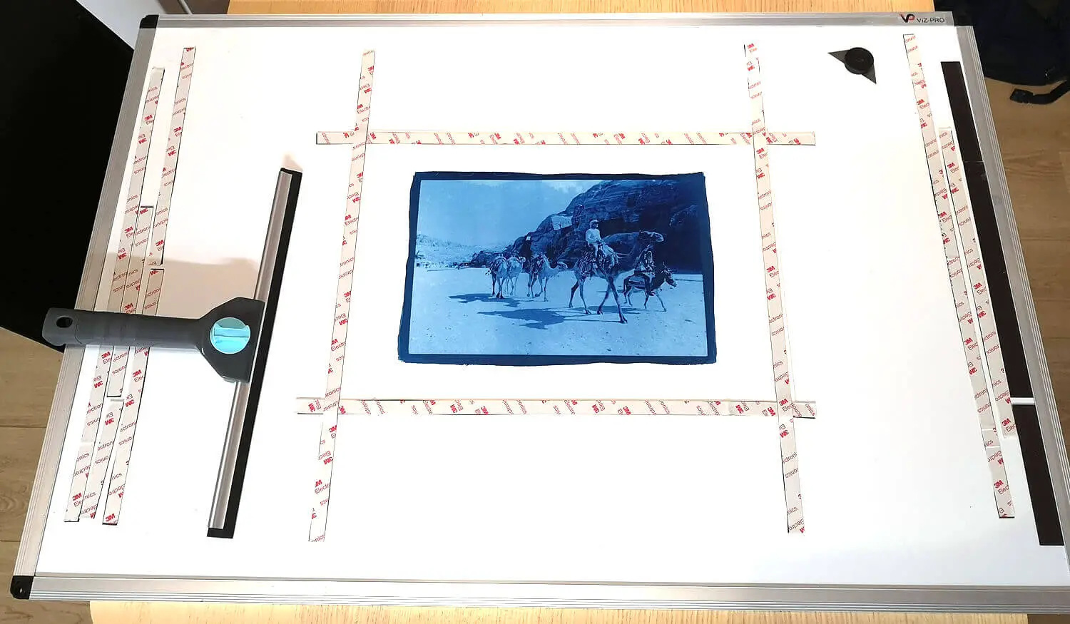 Watercolour paper is hard to keep flat during the drying process. I took a look at baryta paper methods and came up with my own variant of drying paper by fixing it to a pane of glass with gum tape.