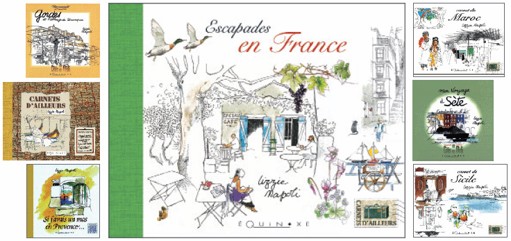 Regionalist publishers interested in the kind of travel book to encourage regional tourism and heritage discovery: Equinox in Provence, Ouest-France, Le Rouergue (Aveyron), Libris (Rhône-Alpes), Ibis Rouge (French Guiana) de Boreas (Auvergne), Coiffard (Pays de Loire), Editions du Cherche-Lune (Vendome). In 1987, Lizzie Napoli has launched, in 1996, like "trip" to enhance the regional heritage through a collection of which she is the author among Shores, became Equinox: Travelogues in Provence; An adventure in Mont-Saint-Michel; Stop in Saint-Malo travel diary; Provence travel diary; Stopover in Corsica: travel diary; My trip to Sète, and Gordes and Sénanque Abbey. My book The tour guide is closely linked to the emergence of travel diary that values excursions, sightseeing tours and regional heritage. Five collections at Equinox 16 focus on regional discovery through the theme of heritage architecture ethnography: in 1995 on the south with squares of Provence, Midi Cities and mosaics, and other regions, from 2000, with squares of France and Squares Britain . These collections include ninety-six titles in square format of the sketchbook.
