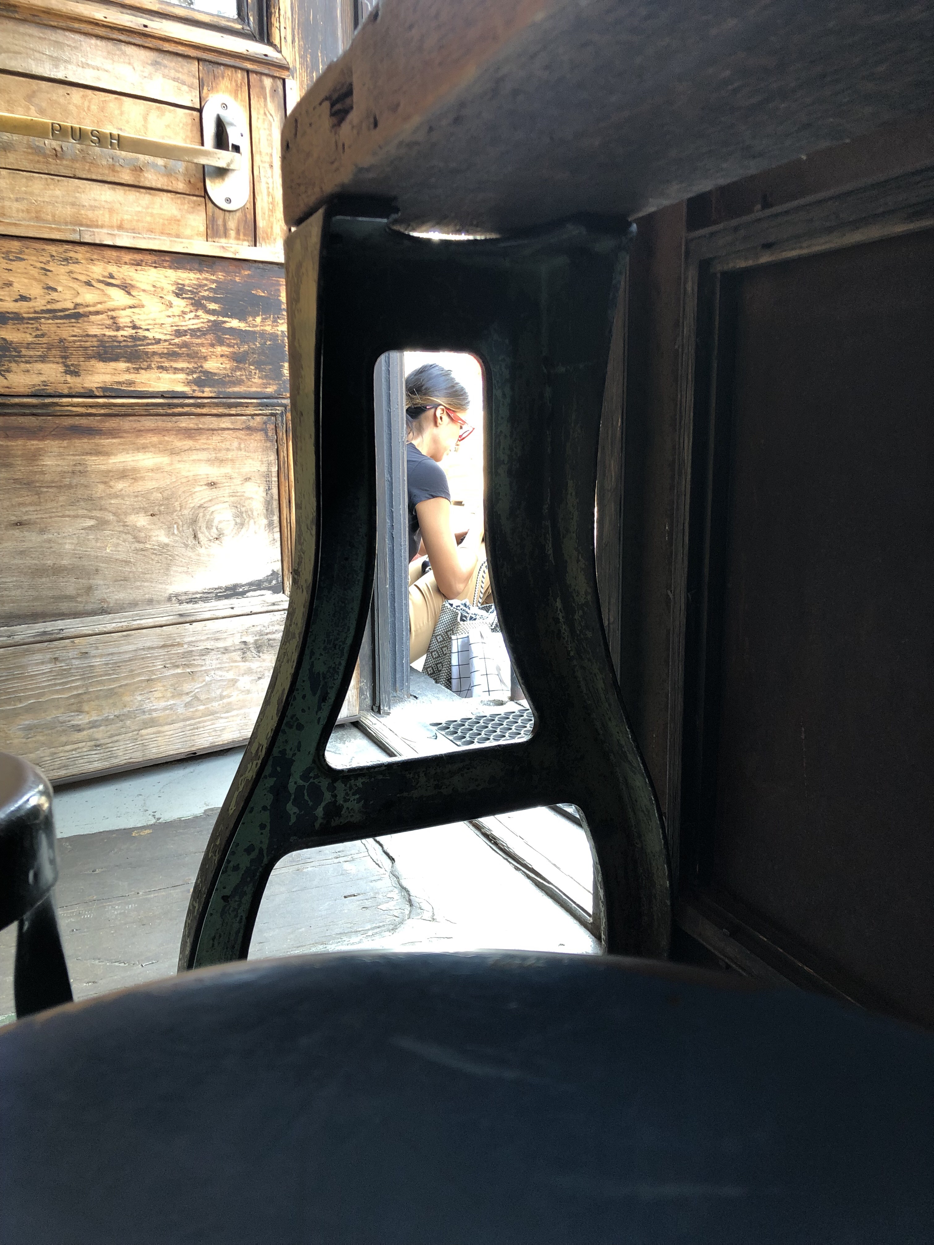 Read some Yelp reviews about Black Brick and was already intimidated by the place. Mean to Asian girls. Nice to white tough lesbians. Nice to Latinas with Dachshunds barking outside. Nice to good looking tall white Dads with strollers and baby carriers. Will they be nice to me? I take a seat with my coffee at the laptop-free table. Opening my camera bag afraid that they’ll reprimand me regardless. I ask permission to take a photo. “For what?” The long-haired braided barista says. “For my personal collection.” I say. He’s not convinced. “Don’t worry, I’m not some Instagrammer or something. I try to compose a shot. Not enough light. A sign? Put the camera back in my bag. I grab the paper. Useless news. Flip. Useless commentary. Flip. And fold. I return it to the laptop free table. Am I done here. Rise. Return to my stool and stare out the window. Why am I reacting? Who am I? Once again. It’s about me. The half-truth. “For what” steps out for a vape break. I want to take his photo as the hot wispy fumes escape from his lips. I can’t do it. No guts! Dang! Instead I snap a phone pic of a lady waiting with her dog. Customers come and go. My left ear overheard, “At a tattoo shop on Friday nights” says For-what. Rant finished. I should probably go.