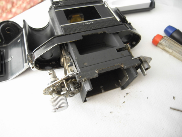 | Jesito wrote: Well, thanks to Attila that sent me a Ihagee EXA body I've been able to know more in detail how these nice cameras do work. Although I haven't been able to fix it yet, I know where the problem is, and I've been able to reach that point in the shutter mechanism. For anyone interested, here are my findings on how to unassemble the EXA: #1, Remove the viewfinder and the take-up spool. Set the shutter speed in the "B" position. ![]() ![]() ![]() ![]() ![]() ![]() ![]() ![]() ![]() ![]() ![]() ![]() ![]() ![]() ![]() ![]() ![]() ![]() Some views, before cleaning and investigating the problem: ![]() ![]() ![]() That's all by now. Jes. _________________ Jesito, Moderator Jesito's backsack: Zooms Sigma 70-300, Tamron 35-135 and 70-210 short, 70-210 long, 28-70 CF Macro, 35-70, 35-80, Vivitar 70-210 KA, Tamron 70-250. Fixed Industar-50, , Tamron 24mm, Tamron 135mm, Sands Hunter 135mm, Pancolar 50mm, Volna-3, many Exakta lenses DSLR SIGMA SD9 & SD14, EOS 5D, Sony A700 and NEXF3, Oly E-330, E-400, E-450, E-1 TLR/6x6/645 YashicaMat, Petri 6x45, Nettar, Franka Solida, Brilliant SLR Minolta X300, Fuji STX II, Praktica VLC3, Pentax P30t, EXA500, EXA 1A, Spotmatic(2), Chinon CM-4S, Ricoh, Contax, Konica TC-X , Minolta 5000, 7000i, 3Sxi, EOS 500 and CX Rangefinders Chinon 35EE, Konica C35 auto, Canonet 28, Yashica Lynx, FED-2, Yashica electro 35, Argus C3 & C4, Regula Cita III, Voigtlander Vitoret (many), Welta Welti-I, Kodak Signette 35, Zorki-4, Bessa-R & L, Minolta Weathermatic, olympus XA2 Compact Film Konica C35V, Voigtlander Vitorets, Canon Prima Super 105, Olympus XA2 and XA3 Compact Digital Olympus C-5050, Aiptek Slim 3000, Canon Powershot A540, Nikon 5200, SIGMA DP1s, Polaroid X530, IXUS55, Kodak 6490, Powershot G9 and G10 CSCCanon EOS-M, Samsung NX100 and NX210, Lumix G5, NEX-F3 Last edited by Jesito on Thu Aug 28, 2008 1:34 pm; edited 2 times in total |