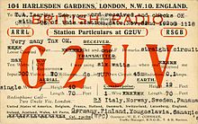 The concept of sending a post card to verify reception of a station (and later two-way contact between them) may have been independently invented several times. The earliest reference seems to be a card sent in 1916 from 8VX in Buffalo, New York to 3TQ in Philadelphia, Pennsylvania (in those days ITU prefixes were not used). The standardized card with callsign, frequency, date, etc. may have been developed in 1919 by C.D. Hoffman, 8UX, in Akron, Ohio. In Europe, W.E.F. "Bill" Corsham, 2UV, first used a QSL when operating from Harlesden, England in 1922.[1]