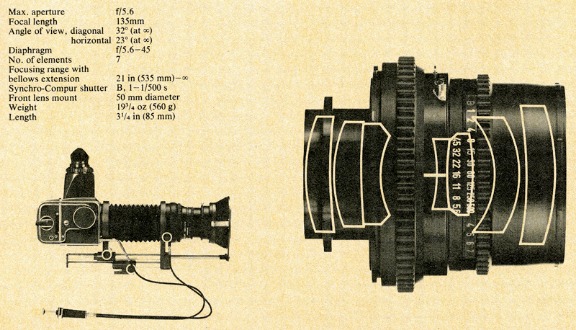 The bellows extension and camera combination are operated with a double cable release. All shutter and camera functions operate in the same sequence as usual. The 135mm S-Planar plus the Hasselblad bellows extension can be used with the Hasselblad 500C/M and Hasselblad 500EL/M.