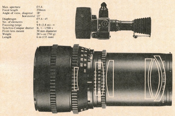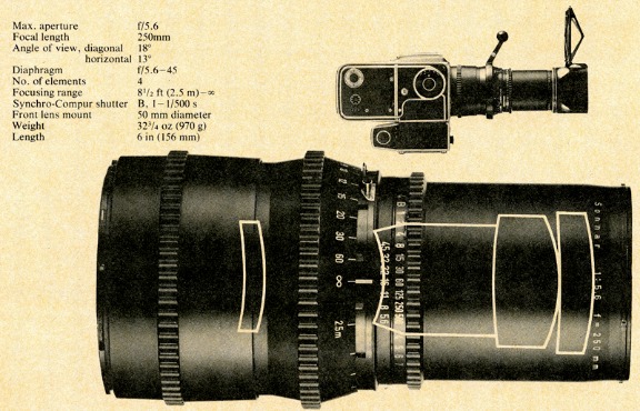 The 250mm Sonnar is a modern design developed in response to insistent demands for a medium telephoto lens. The element groupings are not typical of a telephoto lens, since priority was given to razor sharp resolution across the entire 18° angle of view.