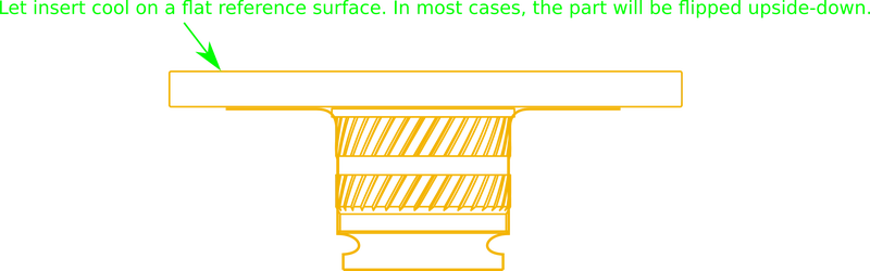 Ok, here’s where we derail from convention. With the insert at about 90% into you part, remove the iron and quickly flip the part onto a flat, heat-resistant surface and gently push the part down until it seats flush with the material. (I use a small piece of sheet metal for this step.) Wait about 6-10 more seconds for the part to cool, and you’re done! I’ll call this maneuver the plate-press technique.
