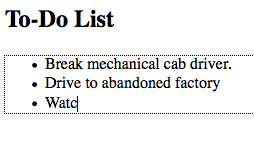 <!DOCTYPE html><html lang="en"><head><meta charset="utf-8"><title>untitled</title></head><body><h2> To-Do List </h2><ul contenteditable="true"><li> Break mechanical cab driver. </li><li> Drive to abandoned factory<li> Watch video of self </li></ul></body></html> |