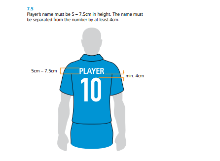 Another form of identification, the player's name, follows a similar rule in that it must be in contrasting color to the shirt. The player's name, which must be positioned at least 4 cm above the number on the back of the shirt, must be between 5 cm and 7.5 cm.
