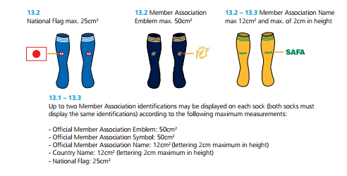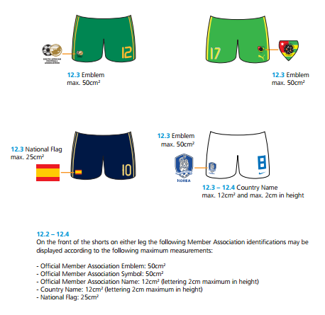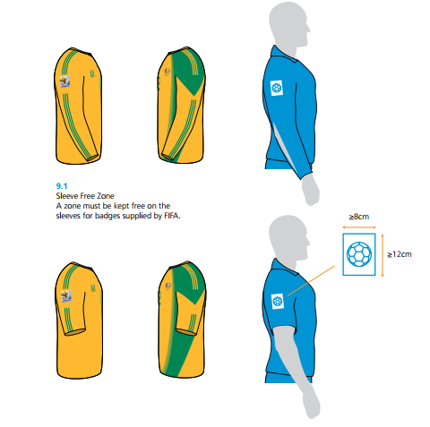 Another guideline the kit must follow is that each sleeve, no matter the length, must keep a 12 cm by 8 cm free zone for FIFA specific badges. This is where the World Cup logo will be placed.