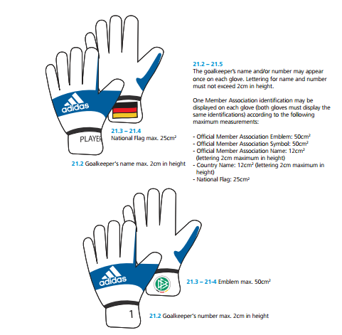 The goalkeeper may wear gloves of any color, but must be in contrast to the shirt. The goalkeeper's name or number may appear once on the left-handed glove, while the country's flag or emblem may appear once on the right.