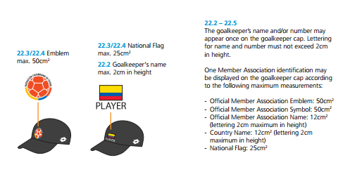 At their discretion, the goalkeeper may also wear a cap of any color, to be affixed with no more than one form of identification, as well as their name. The same goes for any headbands or arm/wristbands that a player may wear.