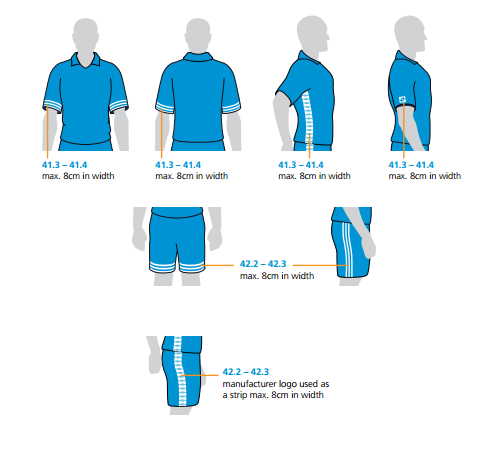 In some cases, such as Adidas' three stripes, a manufacture logo may be incorporated into a strip, which may be placed along the player's side, the cuffs of the sleeve or shorts, and/or the top of the socks. In some instances, a manufacturer may choose to form a repeated pattern of logos to make such a strip.