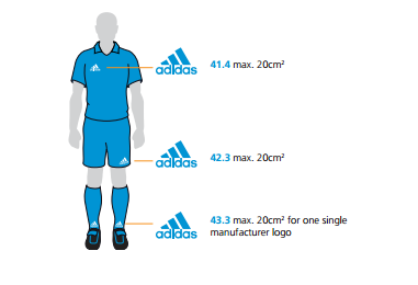 Like member identification logos, manufacturer logos are also subject to regulations. The manufacturer may place its name/wordmark and logo on any equipment item it so chooses, but are only permitted to use it three times throughout the kit. It should be noted that both socks count as one item and shoes are at the player's discretion. The manufacturer logo can be placed in any of the following locations: the bottom of the sleeves, the chest opposite of the member identification logo, the shorts adjacent to the number, and/or the socks.