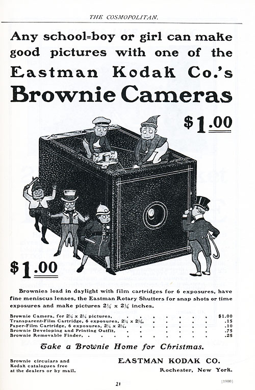 Eastman’s most successful line of box cameras was introduced in 1900, when the company introduced the famous Brownie box cameras. “Brownies” were cartoon characters created by Canadian illustrator Palmer Cox and were featured in magazines and later in his very popular children’s books. Eastman appropriated the Brownie name and Cox’s characters in his advertising campaigns without attribution or paying a licensing fee. [6] Eastman’s advertising equated owning a Brownie camera with the fun-loving, adventurous Cox characters who were always on the cutting edge of new trends and technology. By marketing the Brownie to children, Eastman signaled that the camera was easy to use. He bet that as children grew older they would purchase newer and more expensive Eastman Kodak products. Eastman courted adult buyers by advertising to children, and as one headline proclaimed, the Brownie was a camera “that you and your dad can enjoy together.” [7] Widely advertised in popular magazines of the day, the Brownie sold for a fraction of the price of the Kodak No 1, a marketing and promotional strategy that ushered in a steady stream of film, print processing, and accessory sales. Unlike the original Kodaks, anyone could afford a Brownie and more than 150,000 Brownie box cameras were sold in the first year of production—a marketing success that launched nearly 200 separate camera models with the Brownie name and established the Eastman Kodak Company as the dominant force in photography for 100 years. [8]