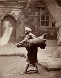 Another revelation (for me) is the extent to which early photographers exploited almost every imaginable use of the new medium. They photographed staged dramatic scenes (as in Julia Margaret Cameron’s “illustrations” for Alfred Tennyson’s “Idylls of the King”). They photographed real people (Henri Béchard’s “Water Carrier, Cairo,” 1875) and imposters (Roger Fenton’s “Orientalist Study,” 1858: two European gentlemen in Turkish costume).