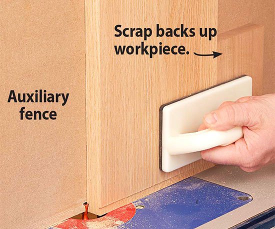 To steady the panels, attach a tall auxiliary fence to your router-table fence and position it to expose about one-third of the bit's width. Make cuts on your test panel with each face against the fence, photo below.