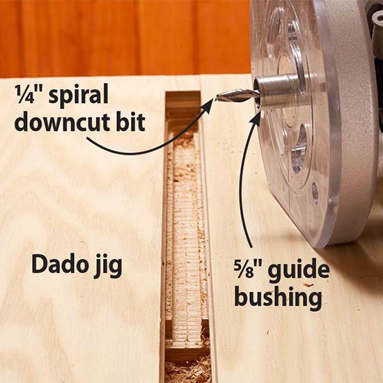 To make this joint, you'll rout the dovetail slot first, then cut and size the dovetail to fit. For the slot you'll need a handheld router and the dado jig shown below. In addition to a 5⁄8 " guide bushing, you'll need a 1⁄4 " spiral downcut bit for clean cuts (a 1⁄4 " straight bit will also work) and a 1⁄2 " dovetail bit. We chose a 7° dovetail bit because it leaves a thicker, stronger "neck" on the dovetail than a 14° bit would. You will shape the dovetail on a router table.