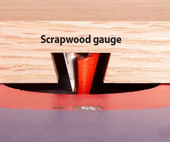 Secure the dovetail bit in your table-mounted router and set the bit height using the scrapwood gauge, below.