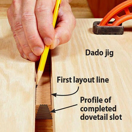 You will cut the dovetail slot in two operations. First, to reduce the load on the dovetail bit, remove most of the waste with the spiral downcut bit. Then switch to the dovetail bit to complete shaping the slot. Because the dovetail slot tapers from bottom to top, the inside edges of the jig do not align with the top edges of the slot, photo below. To reposition the jig accurately for each operation, use the jig to draw layout lines on your workpieces to define both sides of the slots.