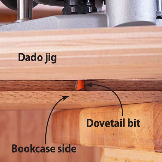 Mount the dovetail bit in the router and set the final depth. For the bookcase, the slot depth matches the rabbet for the back, photo below.