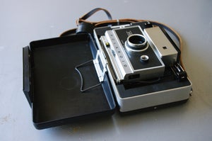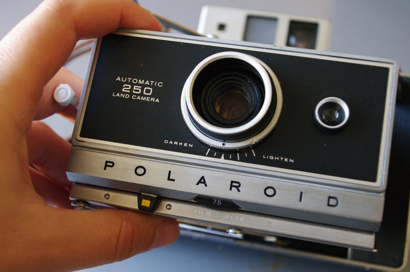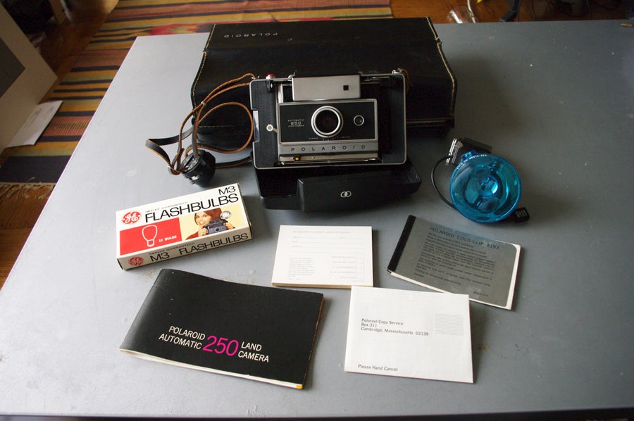 The camera I found was a Polaroid 250 Land Camera. This is one of the higher-end models and boasts a Zeiss-Ikon rangefinder, all-metal body, and 3-element glass lens. It was manufactured between 1967 and 1969.