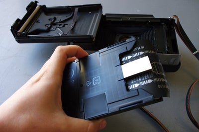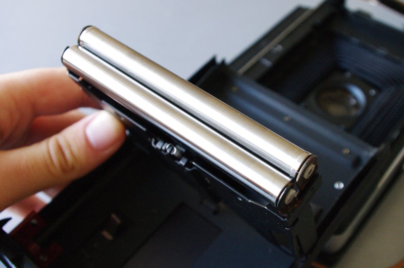 Before you load the film for the first time, you want to inspect the rollers on the inside of the camera that are used to disperse the developer.