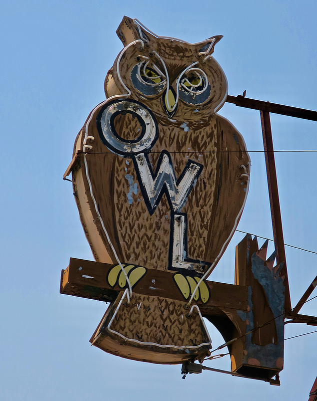 Neon sign for the Owl Cafe, 485 South Cloverdale Boulevard, Cloverdale, California. According to Google and Yelp, this long time local institution is now closed.