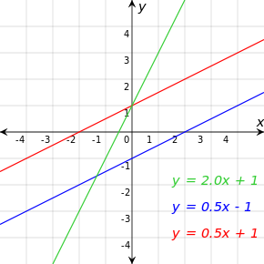 In coordinate geometry, lines in a Cartesian plane can be described algebraically by linear equations. In two dimensions, the equation for non-vertical lines is often given in the slope-intercept form: